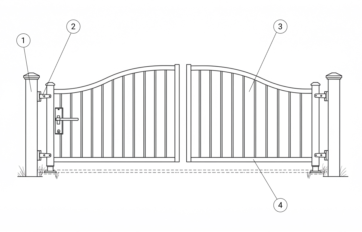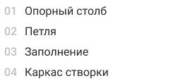 Изделия создают из каркаса, столбов, и наполняют створки выбранным заказчиком материалом. Каркас создан из трубы прямоугольной или квадратной. Для столбов подходит профиль 100х100 мм или 80х80 мм.